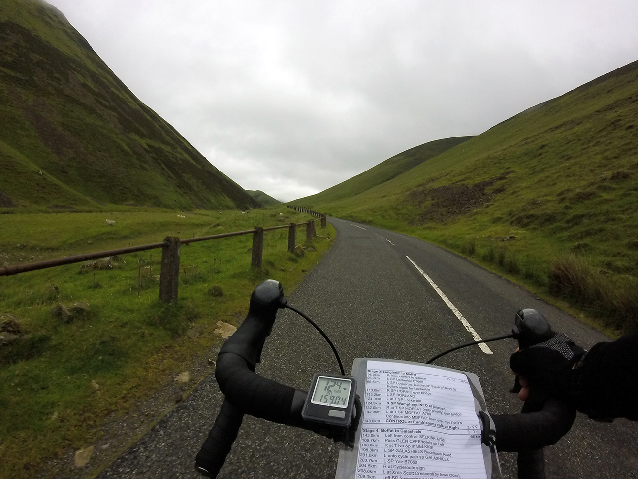 The direct road from Gretna to Moffat is soul-destroying; featureless apart from the road surface, which has too many features (I’ve done this on JoG and I’m also sort of local so I knew it was just a case of head down and keep pedalling). I stopped at Lockerbie Tesco for some emergency food that I thought I might want later, and ibuprofen, which I had by now started taking two of at every control: I’d never done this before, and would only do so again on this kind of ride. A few others stopped here, including a German rider who offered me some chain oil. This was one thing I wasn’t too worried about as I’d put a new chain on and it was still luxuriating in the stuff it came in. Still, it’s probably the only time I’ll be offered lube by a german woman.