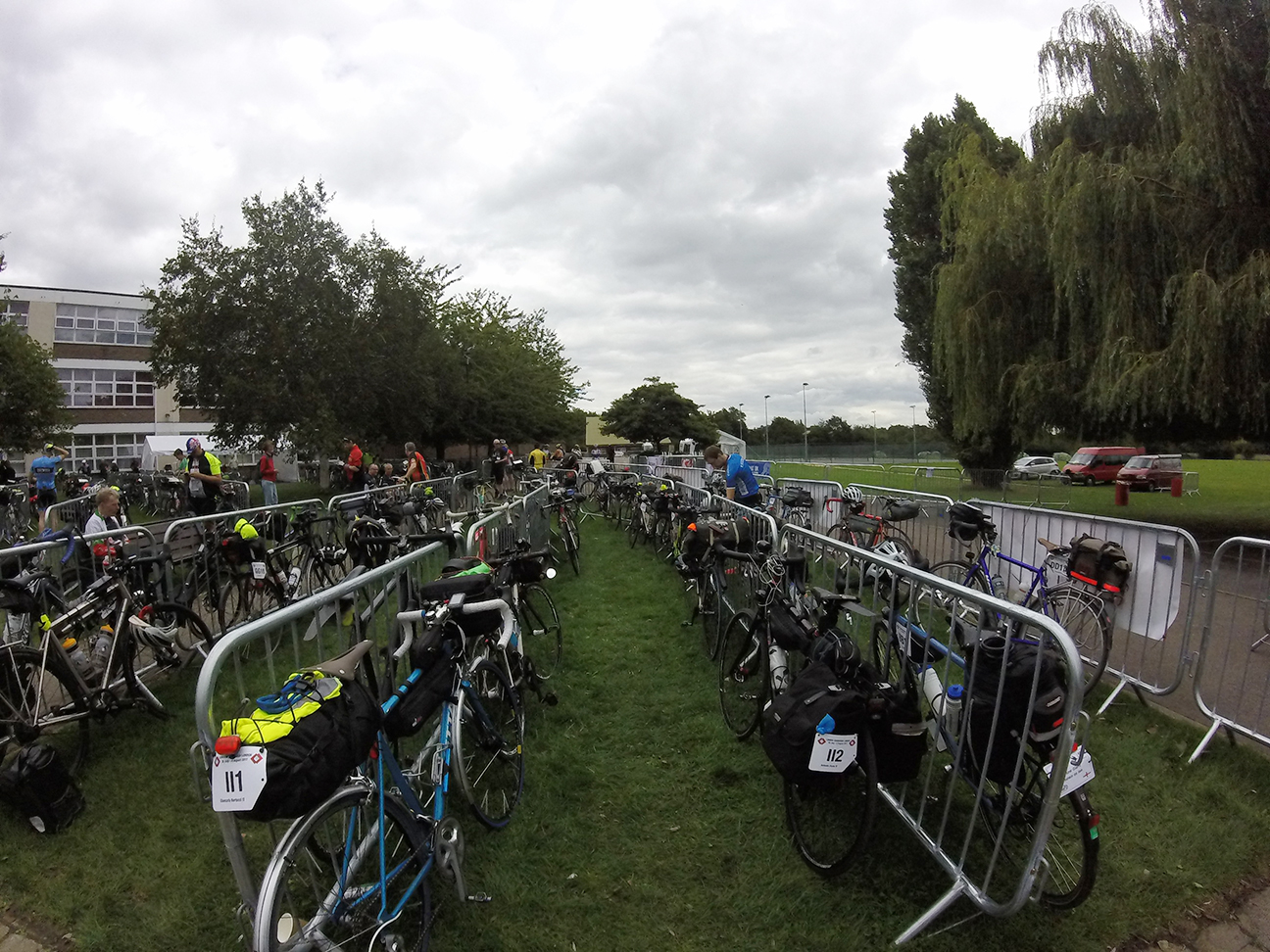 ‘Bike-packing’ luggage seems increasingly popular, but I don’t think I’d change my rack-pack set-up. For me the rack may as well stay on the bike, as it’s been used on numerous rides this year when camping or just dossing in a hall on sleeping mat and bag pre-audax, and every time it comes on and off there is the risk of damaging the mounting threads, so keeping it on is preferable. I have a small bike frame and limited room for either frame or saddle bags. My Super C has great capacity plus being box-shaped you can see and access what’s in it easily. I do have an Alpkit bag just behind the bars; I intended this to be a home for a charger and battery (usb-werk or igaru but I ran out of disposable income), but it has been very handy on audaxes to hold wallet, phone, pen, lip balm and brevet card. On LEL most of these didn’t need to be to hand so it was less useful. In the time before the start I decided it was better to have my waterproof jacket and gloves (a) more easily to hand, and (b) not taking up space in the rack pack, so I used a dry bag with a couple of fixings to keep it on the rack, just behind the saddle. This is probably the best view of it luggage-wise: