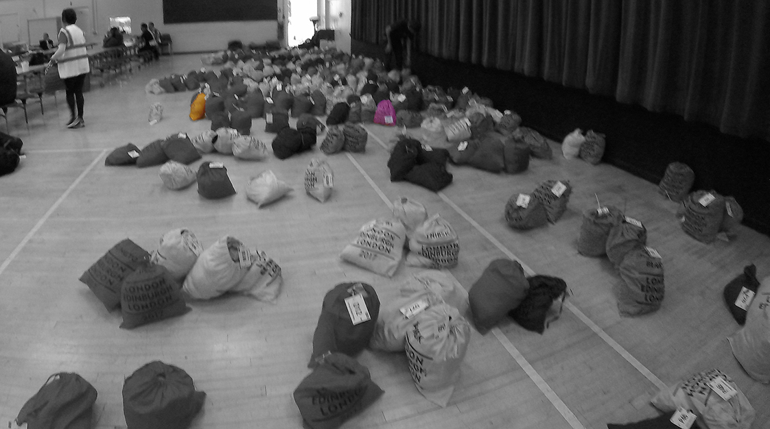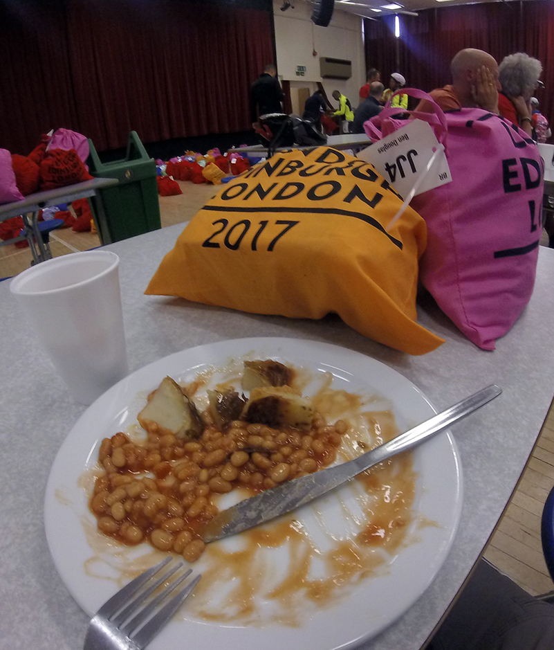 I walked down to Davenant School to collect my drop bags, and hoped I might see Raj, Osian, or the others I’d ridden with. On the way I met Chris Crossland off to find ‘some different food’. He said he’d been in Eskdalemuir when a driver arrived for the drop bags and said Chris was on the list too, so was transported back to Loughton (I hope he was allowed to sit in the cab rather than share the journey in intimate contact with full drop bags). The bags were almost all there (they were still waiting for Spalding I think) and already sorted by letter. I realised I hadn’t eaten in ages and asked if they had anything, I was sent to the kitchen to help myself to potato and beans. I was defeated, but I also knew I couldn’t have gone any further.