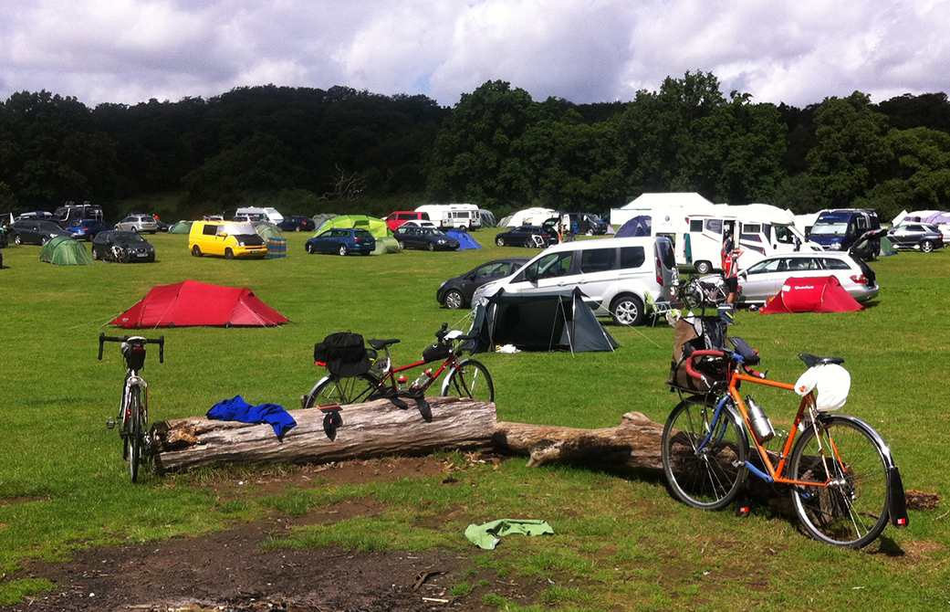 Checking out the bikes: so far one Brompton, another Hewitt, recumbents, only one tandem as yet (although saw a trike this morning), an old Raleigh with a large plastic water bottle with a tube up to the bars, French one with gorgeous lugs, Californian Carbon with couplings…watching the groups starting, still far enough away from my start to be too nervous so maybe should eat before appetite is lost.