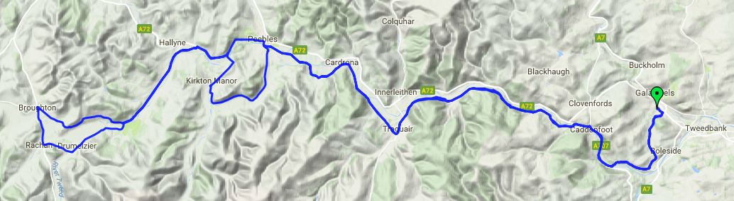 Then such a long freewheel I forgot that I could pedal for a while, until some folk sped past me. Then those familiar places; Broughton, Blyth Bridge, Romano Bridge…eventually a turn-off to new roads at Leadburn. Now the approaching rain was gaining on us. All day it had been on/off, short sharp showers which could be ‘ignored’, but it was clear that this one meant business.