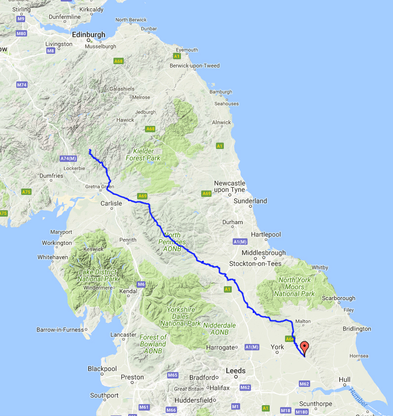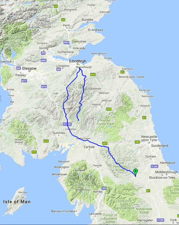 Many sections were fantastic, and I hadn’t enjoyed riding my bike for a long time; I reminded myself to appreciate them while they lasted, not knowing how far I’d get or what lay ahead: Owls hunting over the fens as dawn came on Monday morning. The tailwind allowing me to bomb along at 30 kph. The road past Castle Howard, ridden at least once before (so I know I can do it again etc). Velvety-topped airbeds and soft blankets that will forever be the most welcoming and comfortable beds in the world. Pasta; I had been off carbs in preparation (no bonking at all and hardly any food not at controls, I’m marking that down as a success). Yad Moss going north with drawn breaking. Friends at Barnard Castle. The familiarity of Lockerbie Tesco in such unusual circumstances. Chatting to Maryjane about Hewitts and being technicians. Talking to the guy with the union jack tights in the dark. Ending up in a Yorkshire peloton for a while. Climbing the Beeftub – eventually by bike. The descent afterwards – you could freewheel for ever. Edinburgh to Innerleithen; beautiful hills and deserted roads. Seeing familiar faces: Dave in Edinburgh, Lucy in Innerleithen, Chris everywhere.