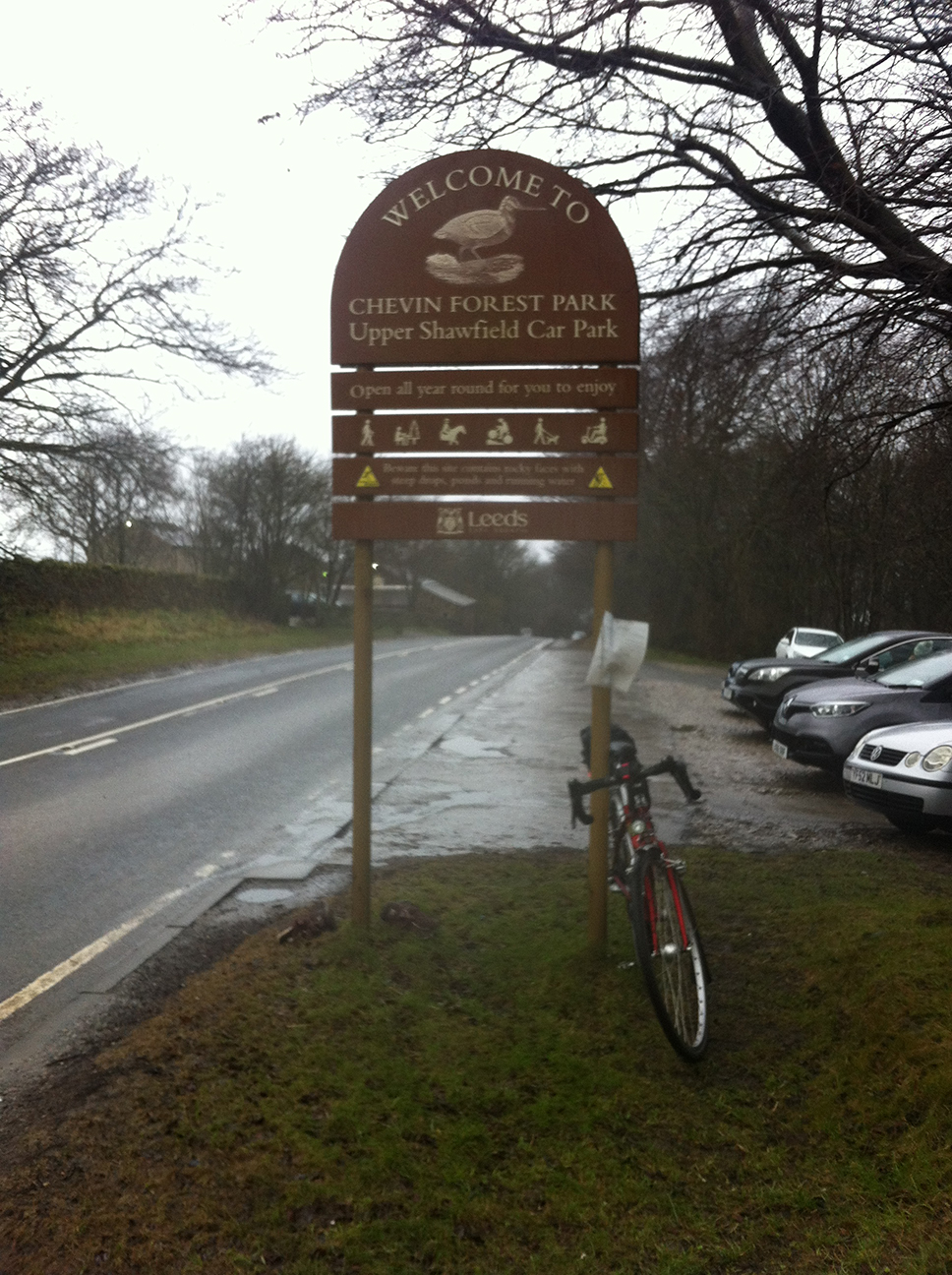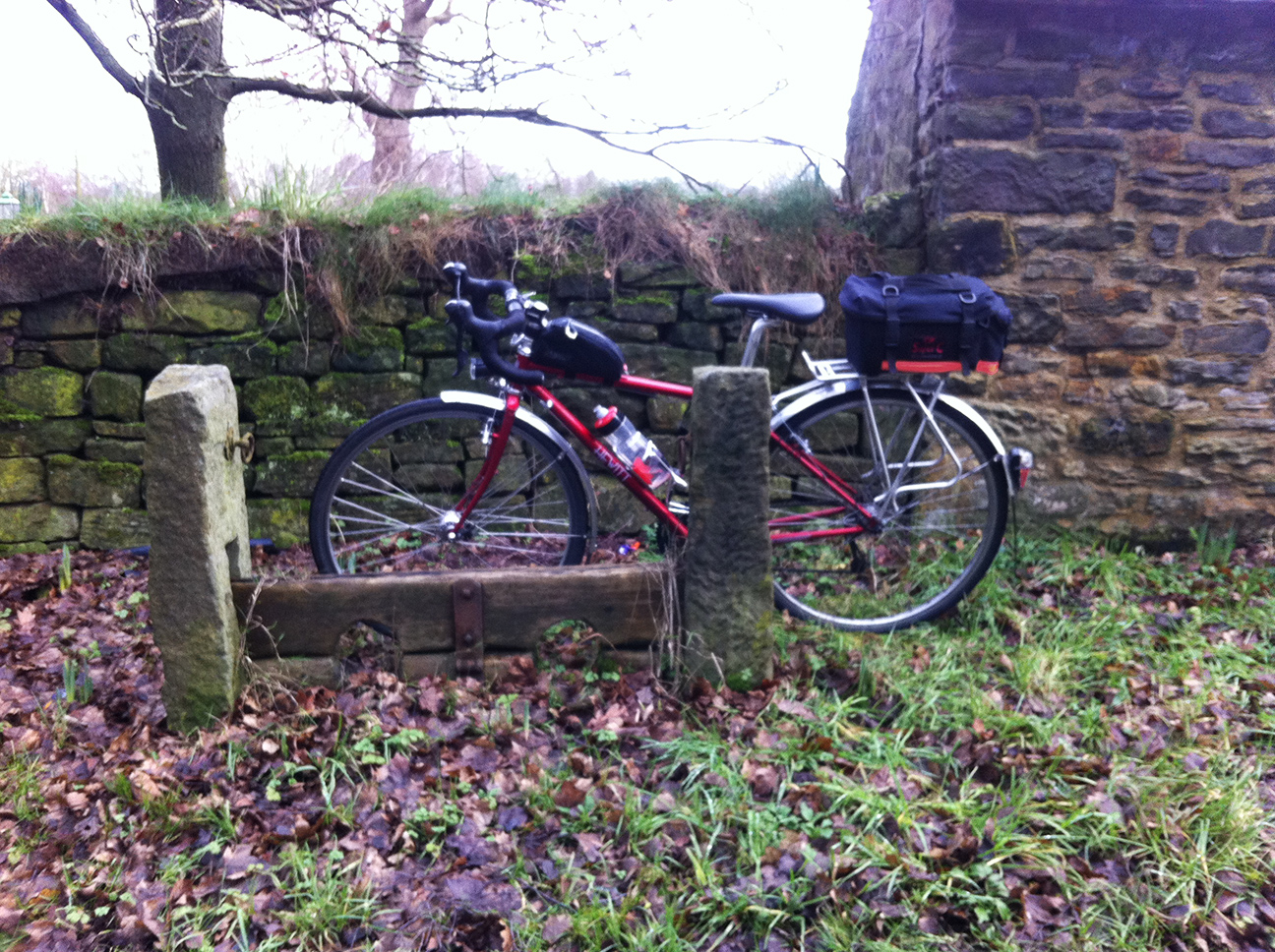 It was cold and wet at the start and riders were coming and going, some seemed to be on the 200 km (which started an hour earlier) and only just starting, so at 8.55 am I decided to get on with it rather than wait around. Perhaps I missed some information about a road closure (which turned out to be passable by bike as is often the case) but I don’t know. The route follows canal and railway line through Littleborough and Todmorden then head up to Holme Chapel and Clivinger, which is a nice section, the steep valley sides had a dusting of snow on the top. Then through urban Burnley and Nelson before Blacko, where I stopped to take a photo for comparison with the last one.