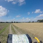 Left the campsite about 10 am which is acceptable for early days of a tour! There’d been a heavy dew overnight but it was a sunny morning. All flat to Stamford Bridge, where the route goes off-road on an old railway line path; the station building is still there and seemed to be used as a community centre. After crossing the River Derwent the route runs along the A 466 briefly then turns along a road marked dead end/private estate. Reaching a farm it becomes a bridleway and crosses a few fields; a wide track but bumpy in places, I’m sure it would be muddy if wet.