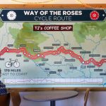 Through Nafferton (‘posh’ says my notebook) and to Driffield, where I stopped for (my own) food. The route doesn’t go through the town centre so I don’t know what it is like. Apart from the hills out of Bridlington it is fairly flat, with lots of arable farmland, wheat/barley and grass, and some tall reed-like things wth no clear edible part. Leaving Driffield the route crosses the railway line three times in such quick succession that two of them are barely distinguishable on the map. Past Skerne and on to Hutton Cranswick to cross an A road. Just after this was a sign for a garden centre/cafe, and although my plan was to avoid too much cake I was flagging so stopped off to refuel. They had a huge WotR map and I could see that the day’s ascent was about to start.