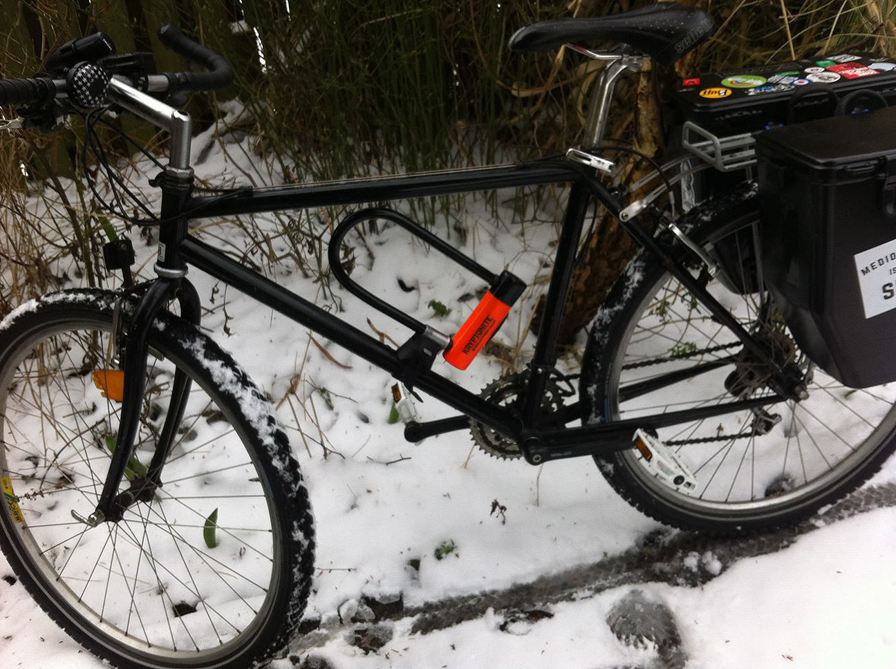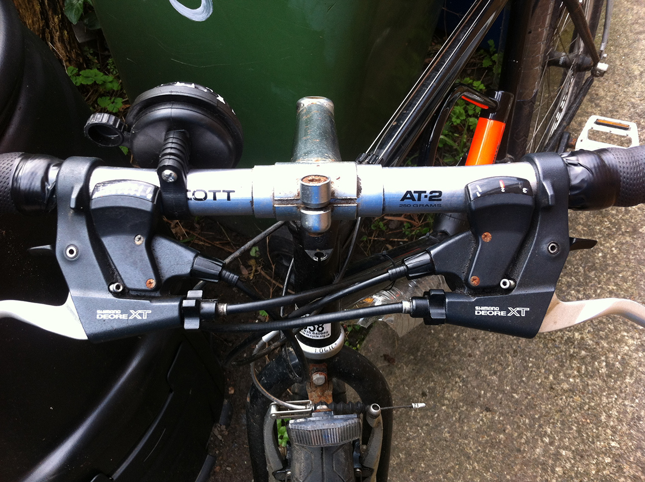 After the theft of the Grater I needed a new commuter/utility/hack bike, and I thought a tatty old rigid mountain bike would nice and practical but also less desirable to thieves. I had a look at a few in Cycle ReCycle (CRC, where I volunteer); rigid adult MTBs are usually around £50 but this was £70 as it is relatively light and has decent components (Shimano LX), although they let me have it for free. The frame is completely black but the bars say Scott AT2 on, and the wisdom of the internet as identified it as a Boulder of around 1995. It has a few little bits of rust which add to the anti-theft nature of it but are superficial.