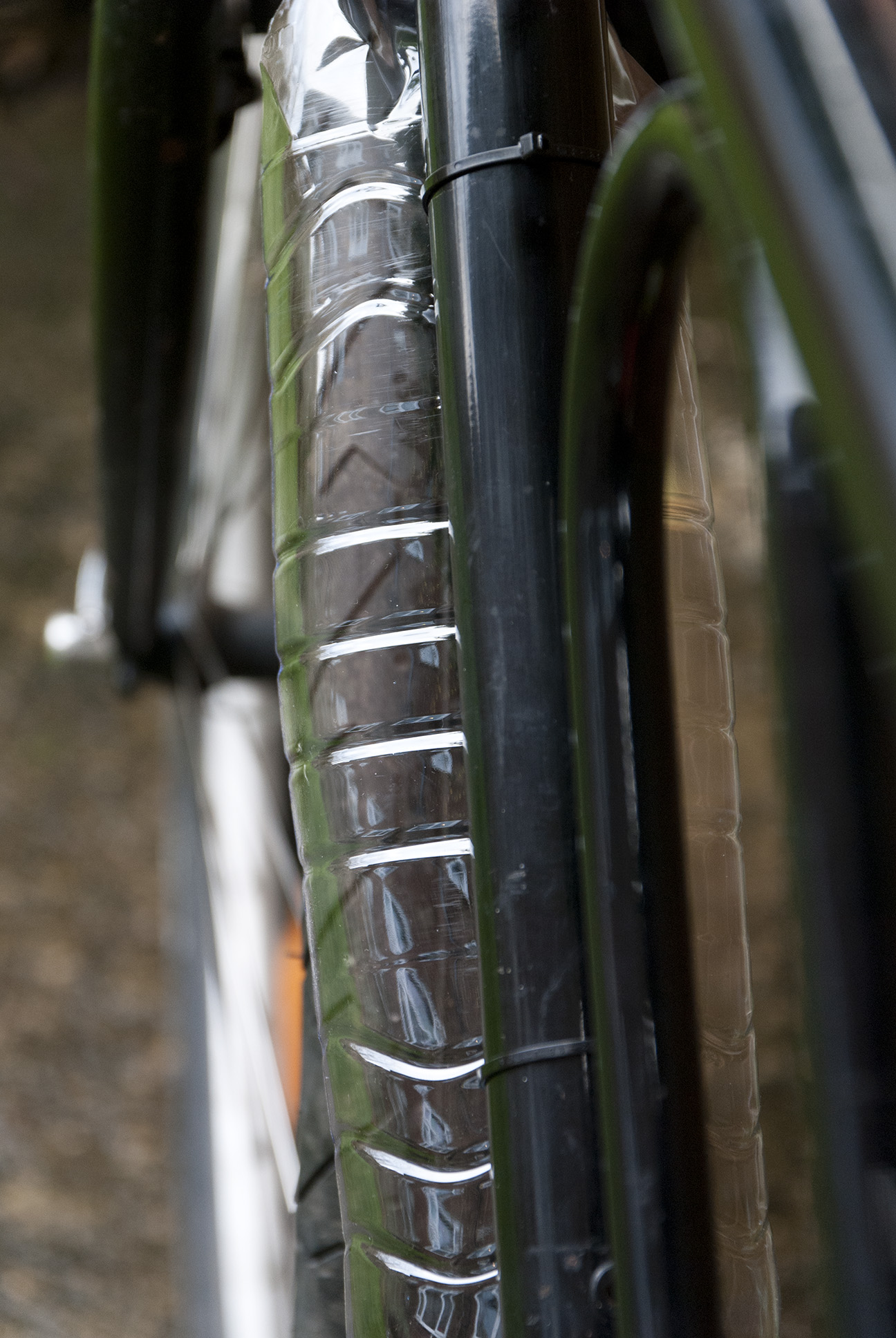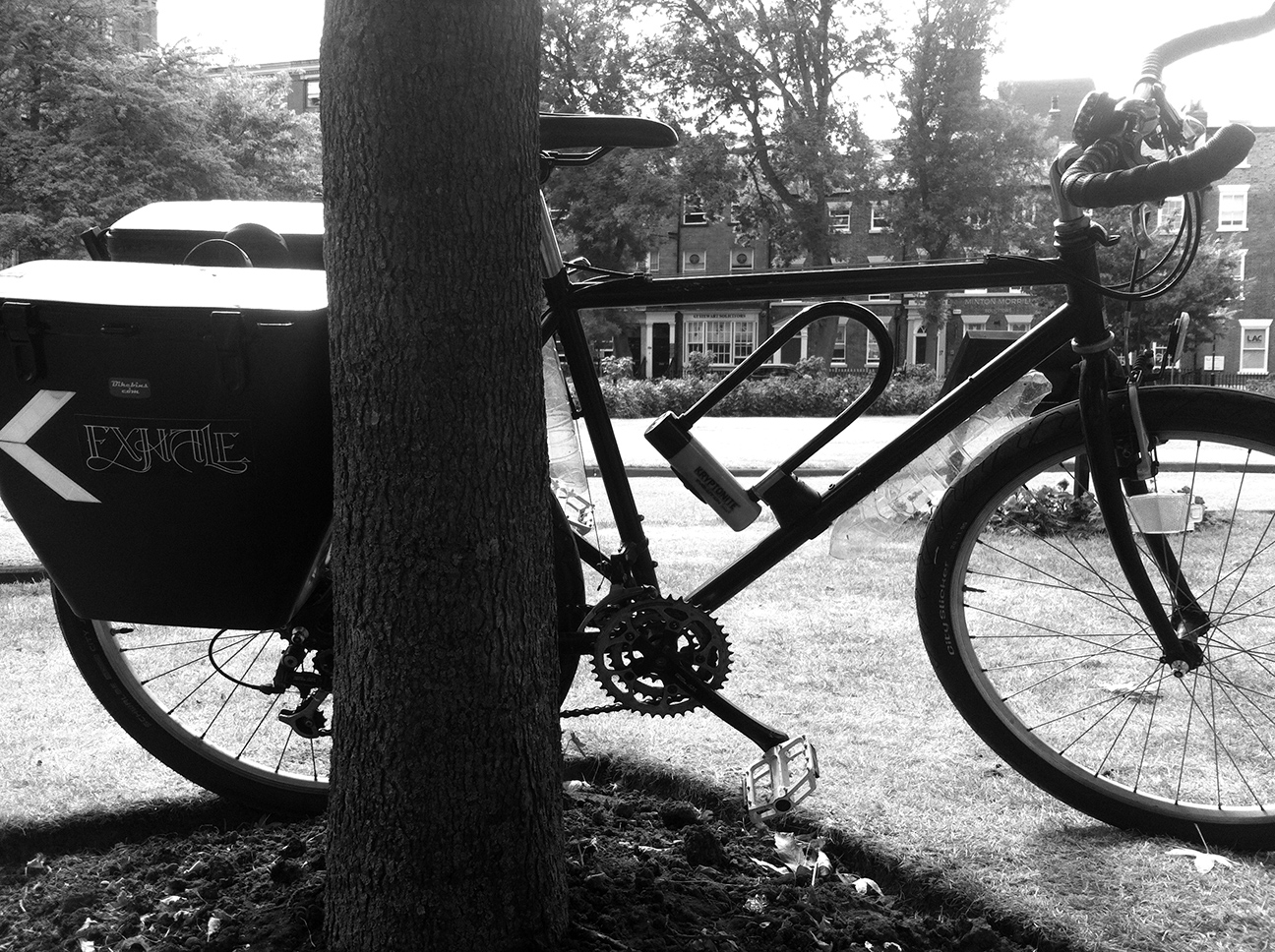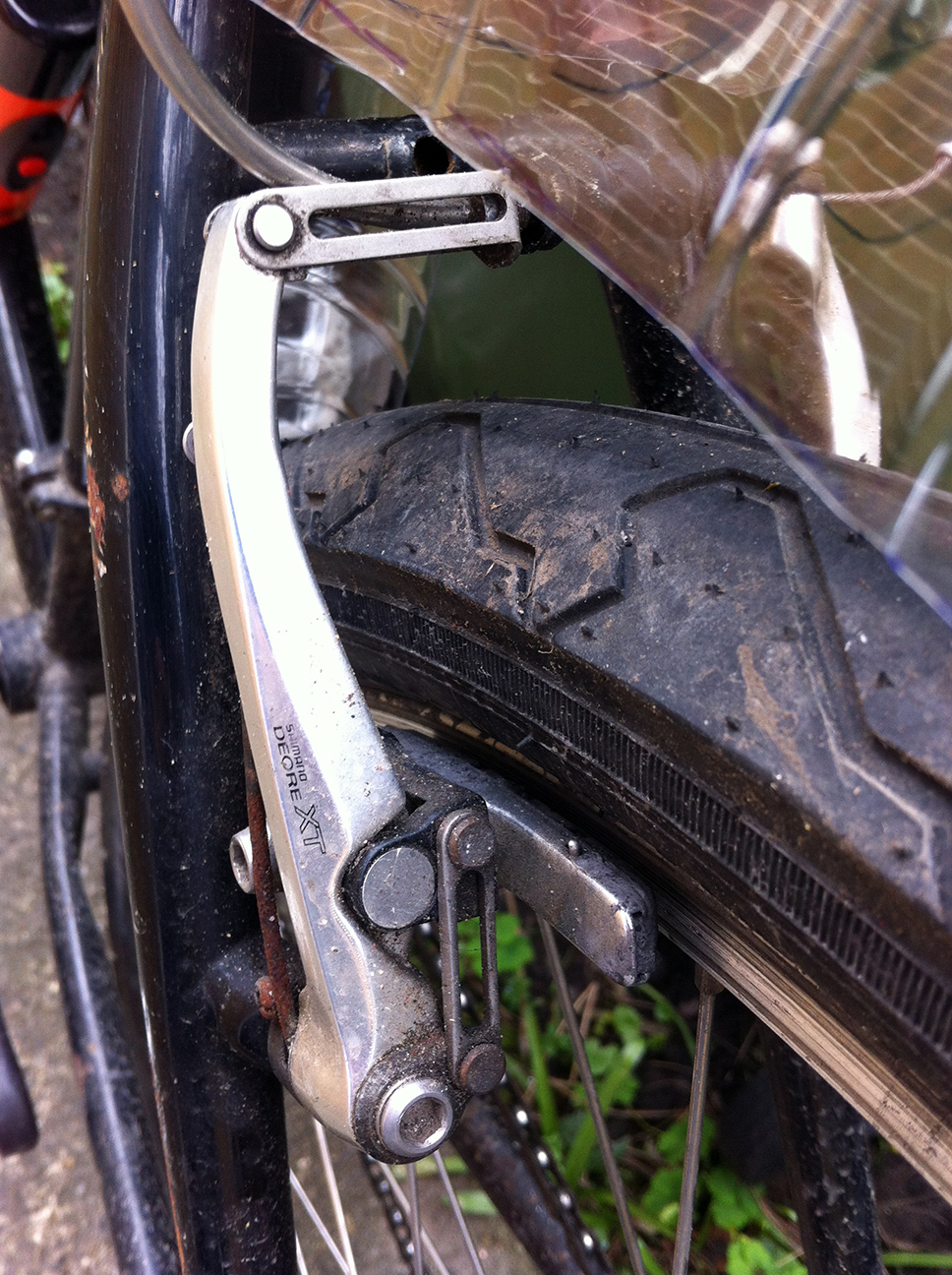 I changed the knobbly tyres before leaving the shop, to some used slicks that we had lying about (rear a Schwalbe City Jet and the front a Tioga City Slicker which looks almost identical), and found an old rack which needed some bending to fit. The top tube height is fine but the reach was ridiculous, so I changed to an in-line seat post and a shorter stem, being able to swap both for used components from CRC. It needed new bar tape and I’ve changed the saddle to one of my collection. I fitted emergency mudguards made of Aldi water bottles (17p), the rear isn’t too ineffective but the front, being down-tube mounted, only protects when travelling in a straight line. Still it’s better than nothing. A new chain was required after the existing one snapped in a busy-junction scenario (always the way). I love the fat tyres, they are really comfortable, but I’m not sure that they leave enough clearance for proper mudguards, which I do need. Longer term I’d like to fit a hub dynamo and lights.
