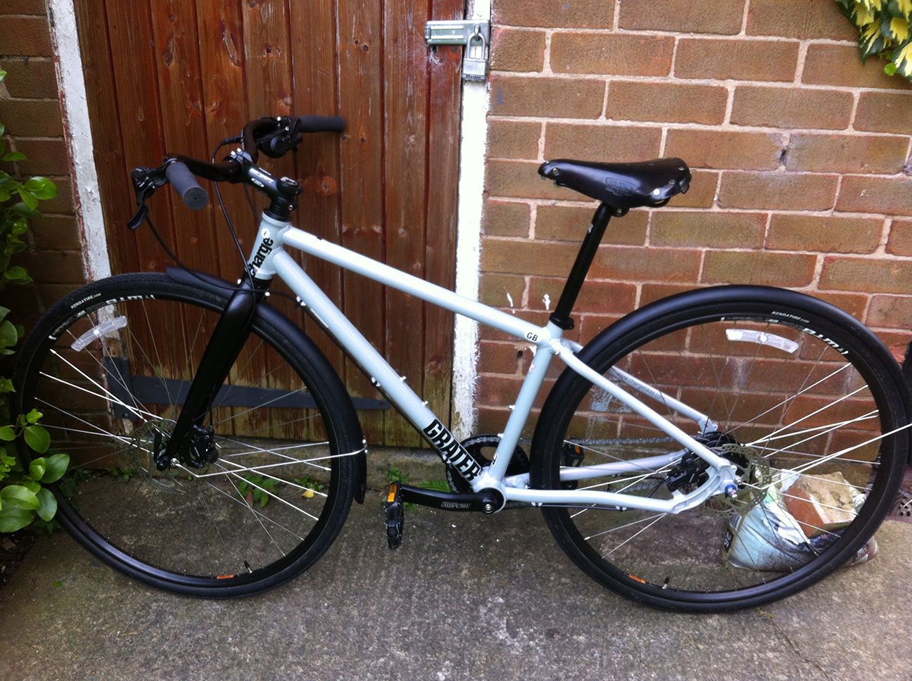 This was an eBay bargain…when my Trek needed new rims I started thinking about other changes that I would make for a fantasy commuter, started looking for a hub gear, and ended up finding one that came with this bike for about the price of a new hub. Hence the Trek was retired. I thought the Grater was a small size when I bought it but it actually was an extra small, and I think the small would have been a better fit for me, but it was nice and comfortable for pootling to the shops and going to work. The 8 speed gear range was fine for getting up the hills in Leeds, with the added bonus of being able to change gear when stationary. I fitted my Brooks saddle and On-One Mary handlebars (which I love), fitted a rack and changed the pedals.