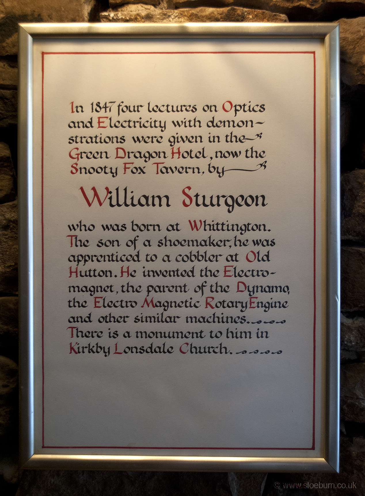I thought it was quite appropriate that I should have my dinner where someone whose inventions led to the dynamo gave lectures, as I had been using mine this morning. I'm not sure why someone gifted this chair to the pub - maybe Mrs N Smethurst was having a clear out.