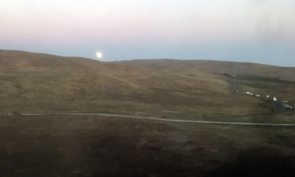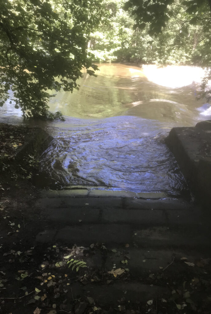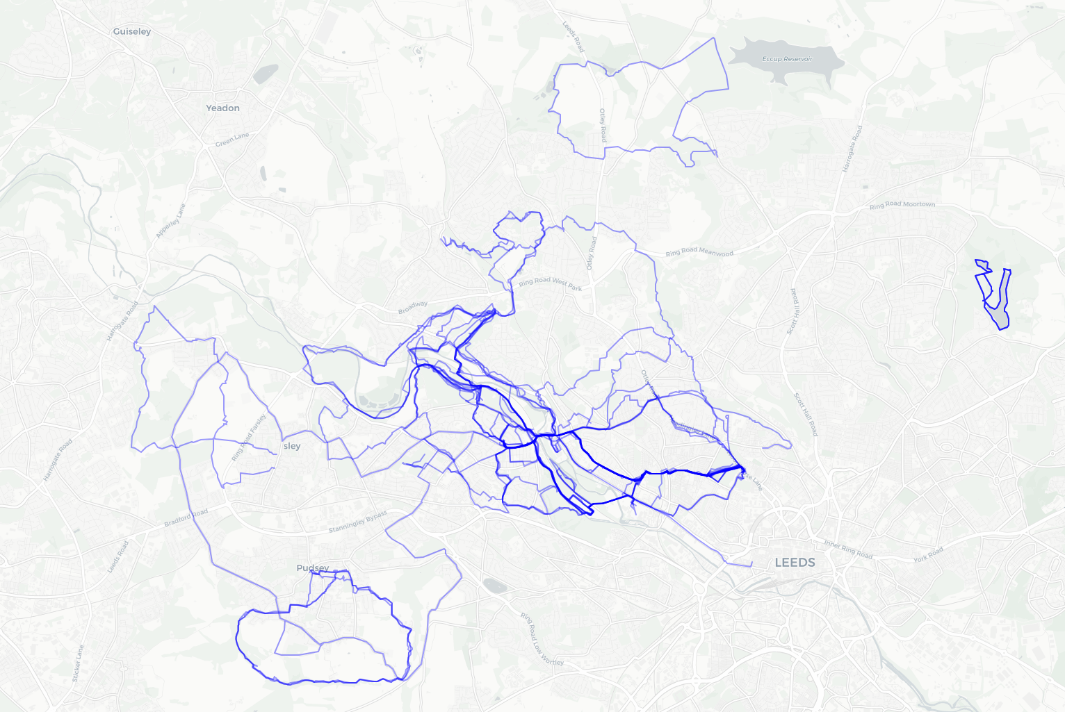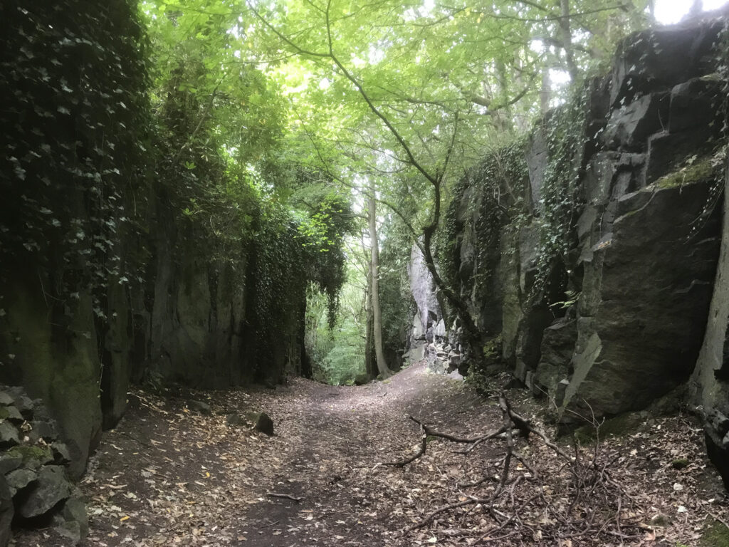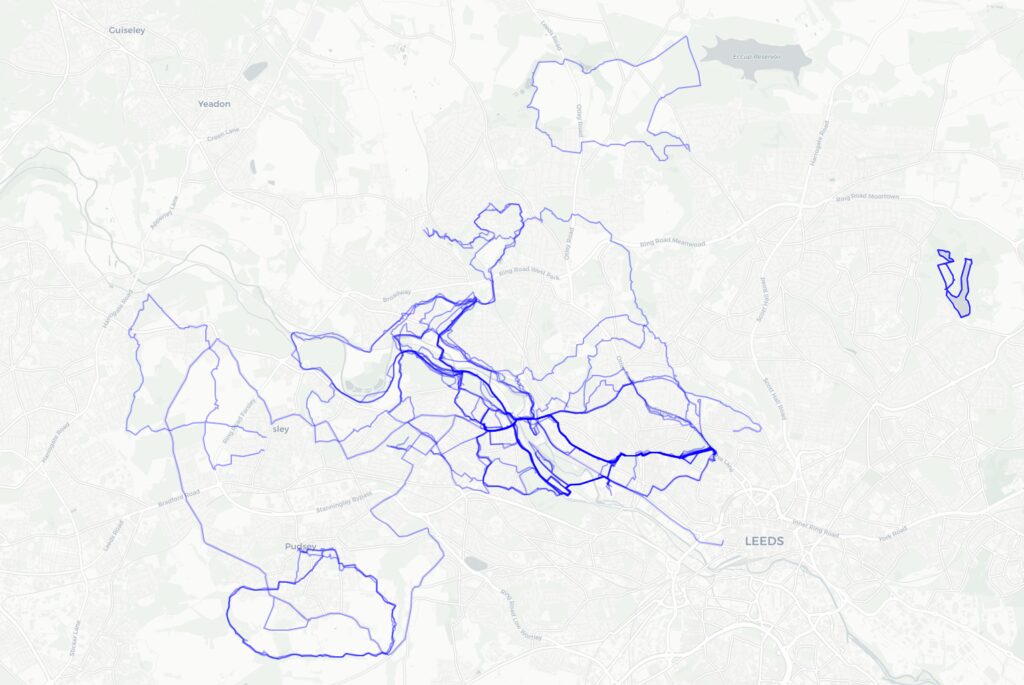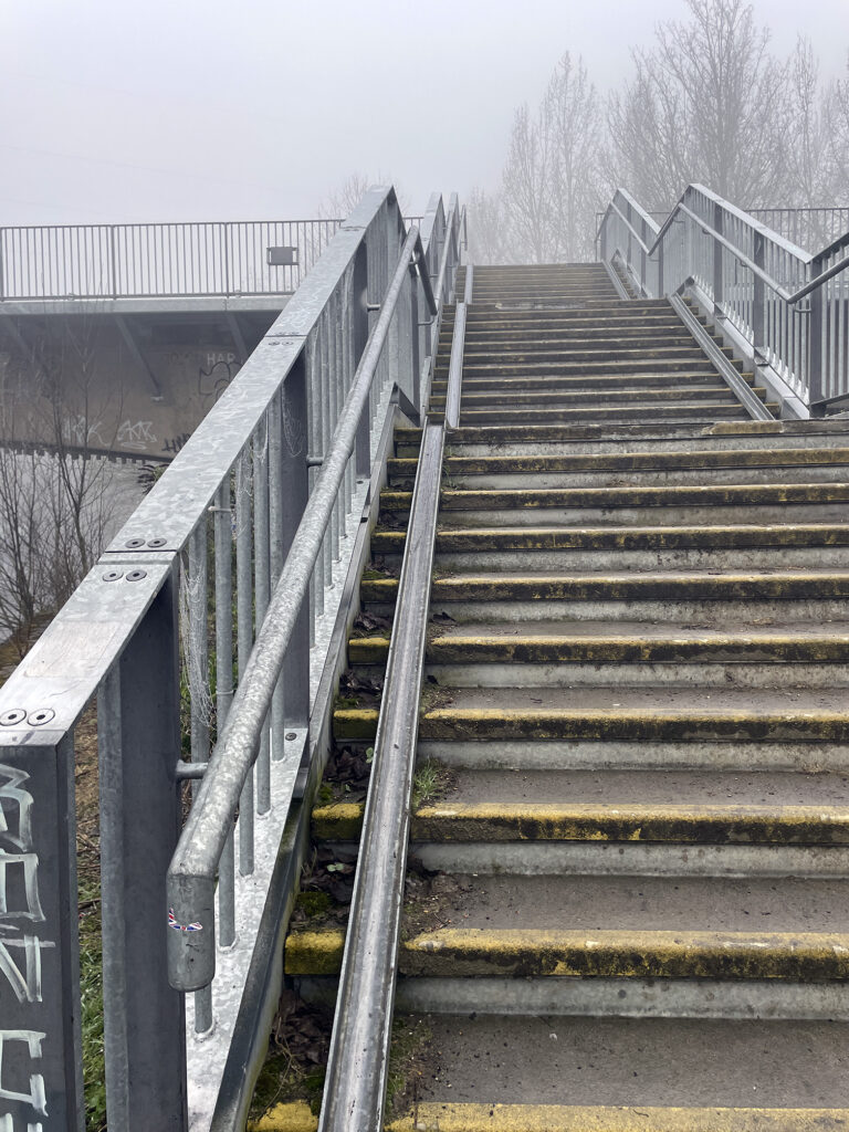The first leg began on my commute route and followed the Leeds & Liverpool Canal towpath into the city centre, then continued on a cycle path along the river Aire. My Garmin had its usual fit early on when I had only got as far as Leeds Royal Armouries museum, but I put thoughts of returning home to the back of my mind and managed to get it going again. This was entirely expected so I was also using the OS maps app on my phone to record the route and could use it to navigate if needed. Last time I came this way a set of steps and roadworks marked the end of my short ride, but now that bit was passable, only to be met with another set of steps after crossing the river. A pair of lights, or some giant’s eyes, peered out of the mist at a waste facility ahead. The track to wheel bikes down was awful (yes this is an official cycle route), being so steep that even a lightly loaded two-wheeler was a handful to control.