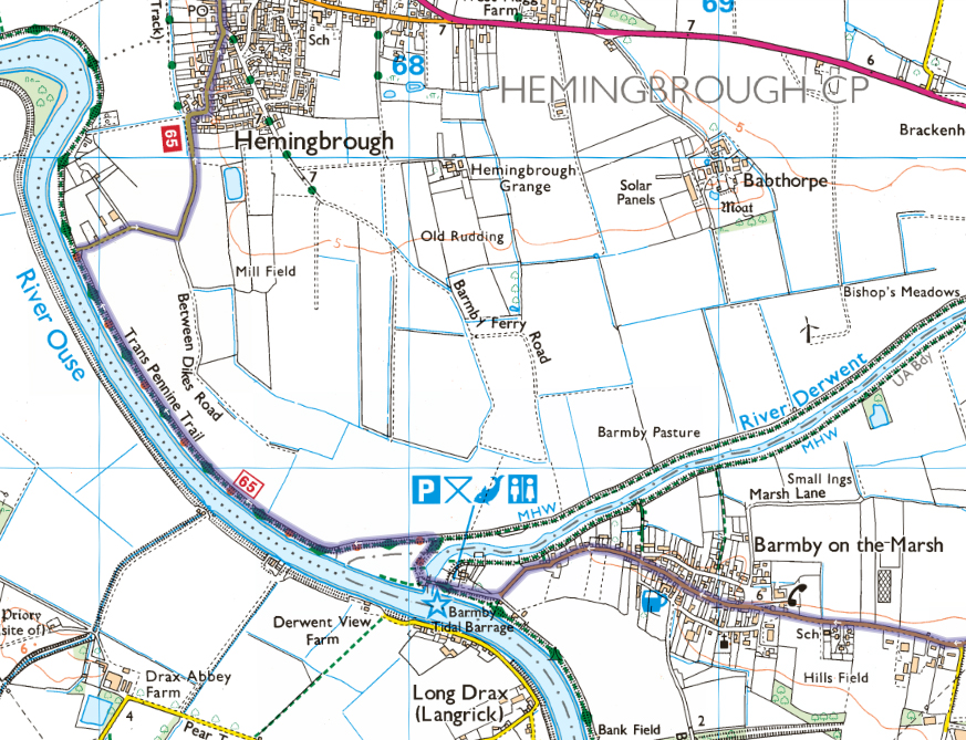 To Airmyn, and some roads familiar from the Spurn Head, and over the Ouse at Boothferry Bridge just after the Aire has joined it. After following the road to Barmby I had naively planned to follow the cycle path for a couple of kms along the Ouse to Hemingbrough. After crossing a tidal barrage this turned out to be a grass track (I had to double check I was going the right way, it looked so unlikely), then a mixture of single track along which my rear wheel fishtailed, and a muddy section I had to walk through. A lesson in just because you may cycle, doesn’t mean you should.