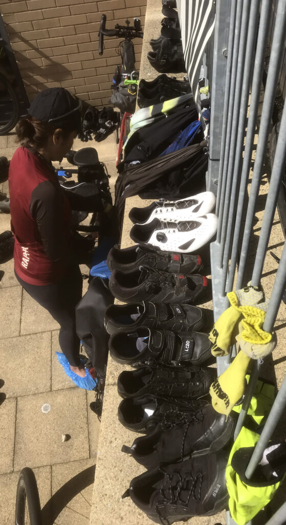 Eventually it was announced that riders could return on the south-bound route from wherever they were when they stopped. Many were keen to have their brevet cards stamped in the return box, so we set up a desk and volunteer with the stamp, and some ‘pens’ made up of the metal barriers to allow a slow release of cyclists into what had become a bright, dry day.